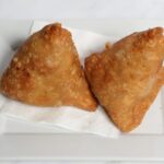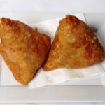 Served as 2 pieces of Flaky, deep fried crispy pastry parcels stuffed with a spicy potato & peas filling (with chutney)