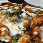 Flattened samosa, topped with chickpeas, yoghurt, minced onions, tomatoes & chutney